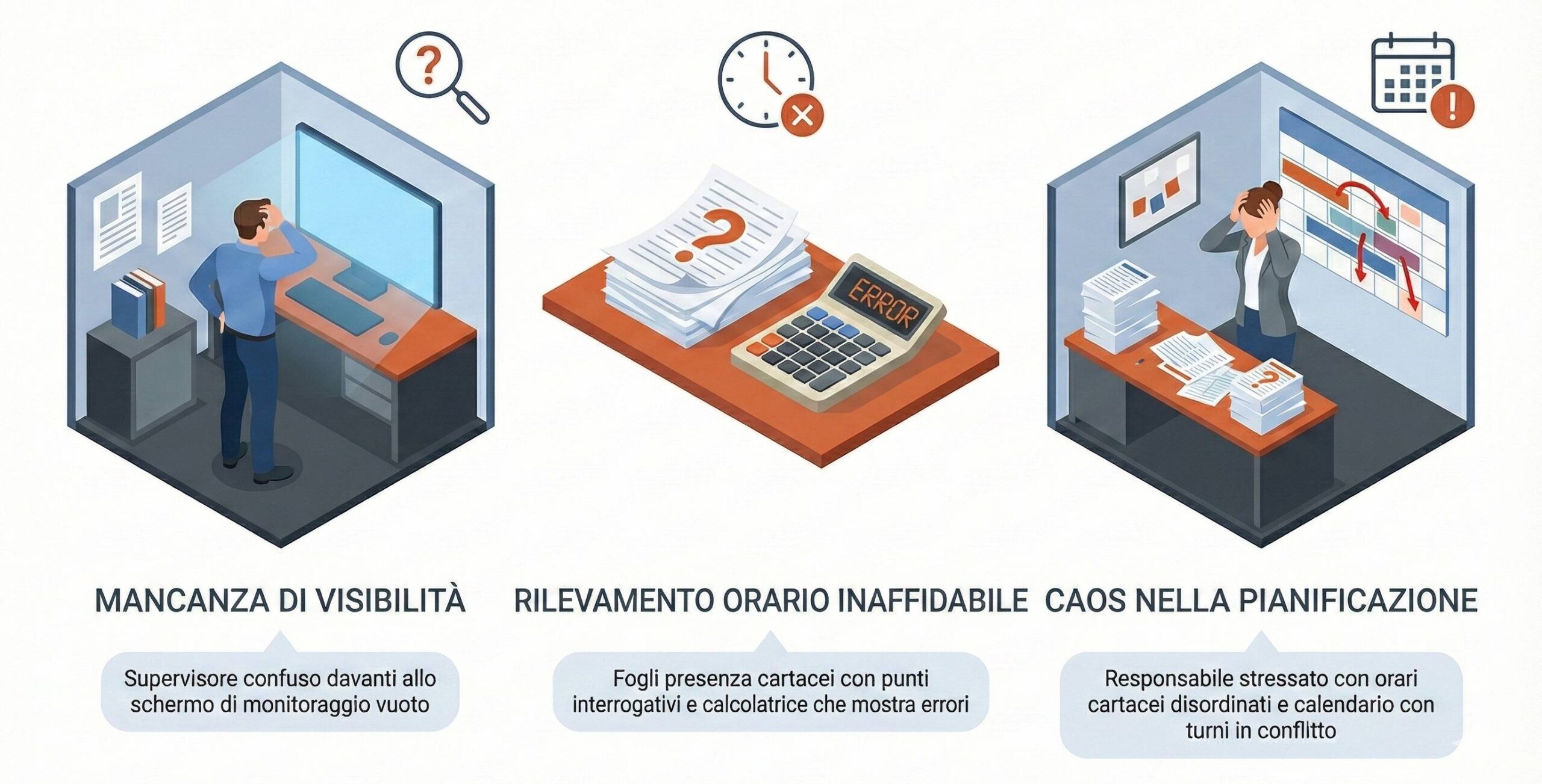 Unternehmen, die im Sicherheits- und Reinigungssektor mit externem Personal tätig sind, stehen täglich vor komplexen Herausforderungen. Das Management von Teams, die über mehrere Standorte verteilt sind, die Schwierigkeit, die Anwesenheit in Echtzeit zu verfolgen, und die Unmöglichkeit, die betriebliche Effizienz zu überwachen, führen zu wirtschaftlichen Verlusten und Ineffizienzen, die sich im Laufe der